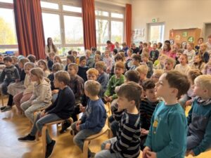 In diesem Jahr präsentierten die Klassen 4 ihr Projekt „Steinzeit“, die Klasse 3 berichtete von ihrem Waldtag mit der Baumpflanzaktion. Die Klasse 2 trug passend zu den Osterferien eine Osterhasengeschichte vor und das 4 Schuljahr überraschte alle mit selbst verfassten Gedichten.